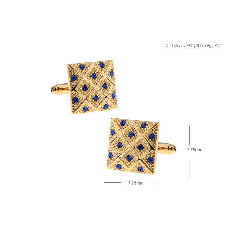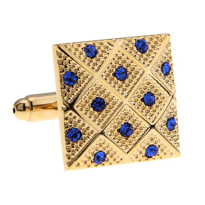 Mansetinööbid kirurgiline teras ja kullatud kollase kullaga, peal väikesed sinised tsirkoonid, reljeefne muster. Mansetinööpide mõõt 17,75x17,75mm.