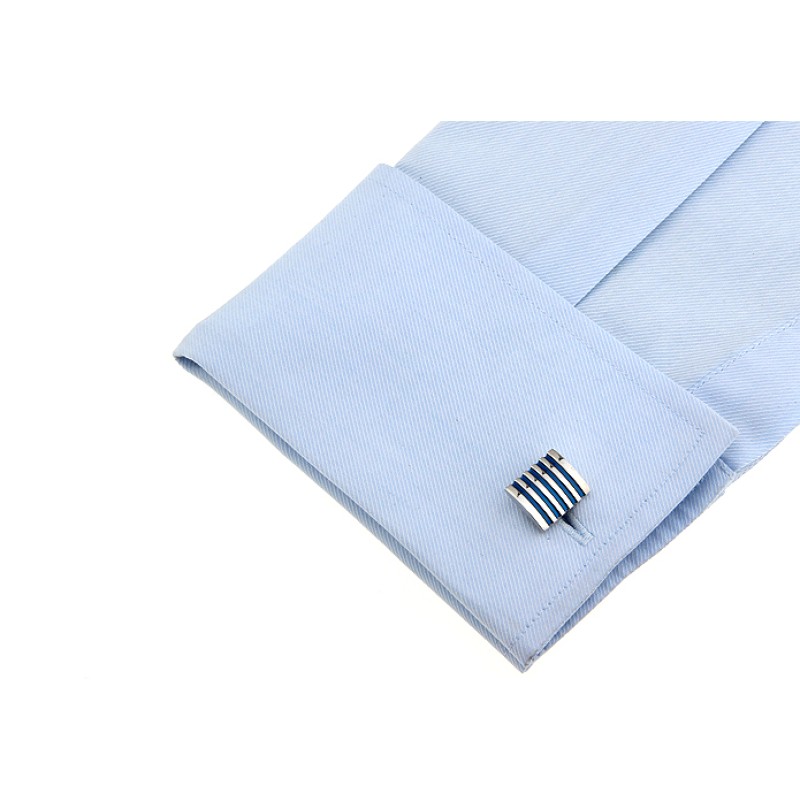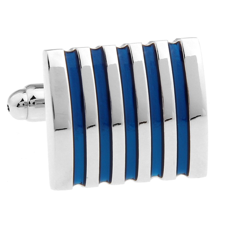 Terasest mansetinööbid, hõbedased, sinistes toonides emailitud triibud üle plaadi. Mansetinööpide mõõt: 14x16mm
