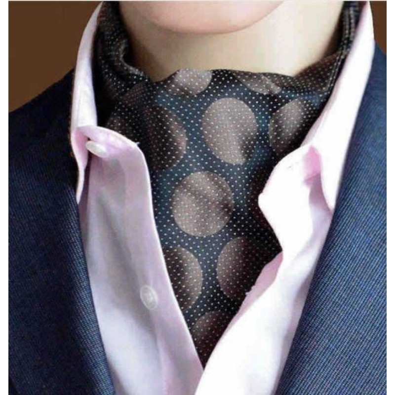 Meeste siidine kaelarätt,mustal põhjal suured pruunid mummud ja väikesed valged täpid. Kaelaräti mõõt: 118x5,5x16cm