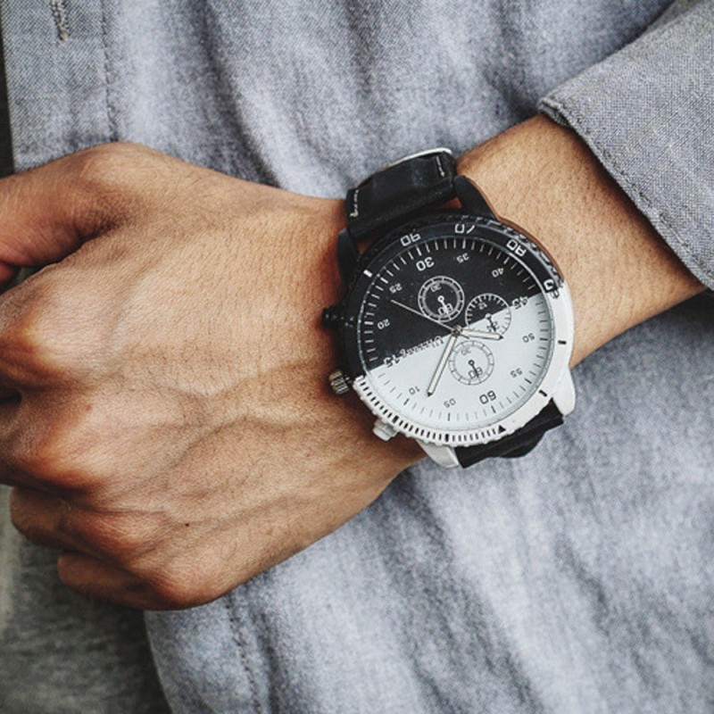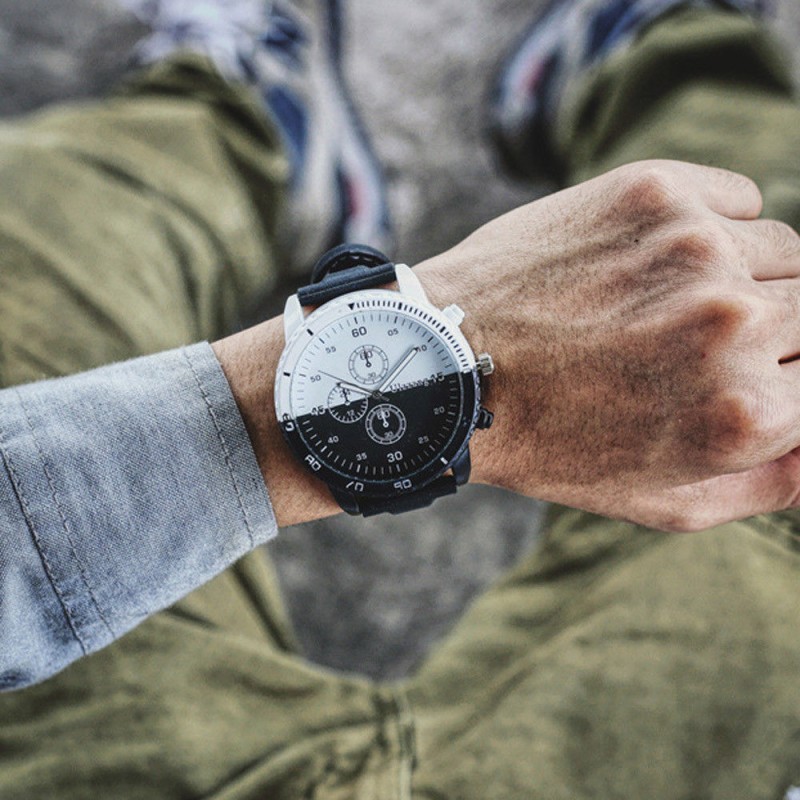 Meeste käekell - suurem must-valge kell.  Rihma laius 23mm, kella displei läbimõõt 48mm, korpuse paksus 14mm. Rihma pikkus 26cm.