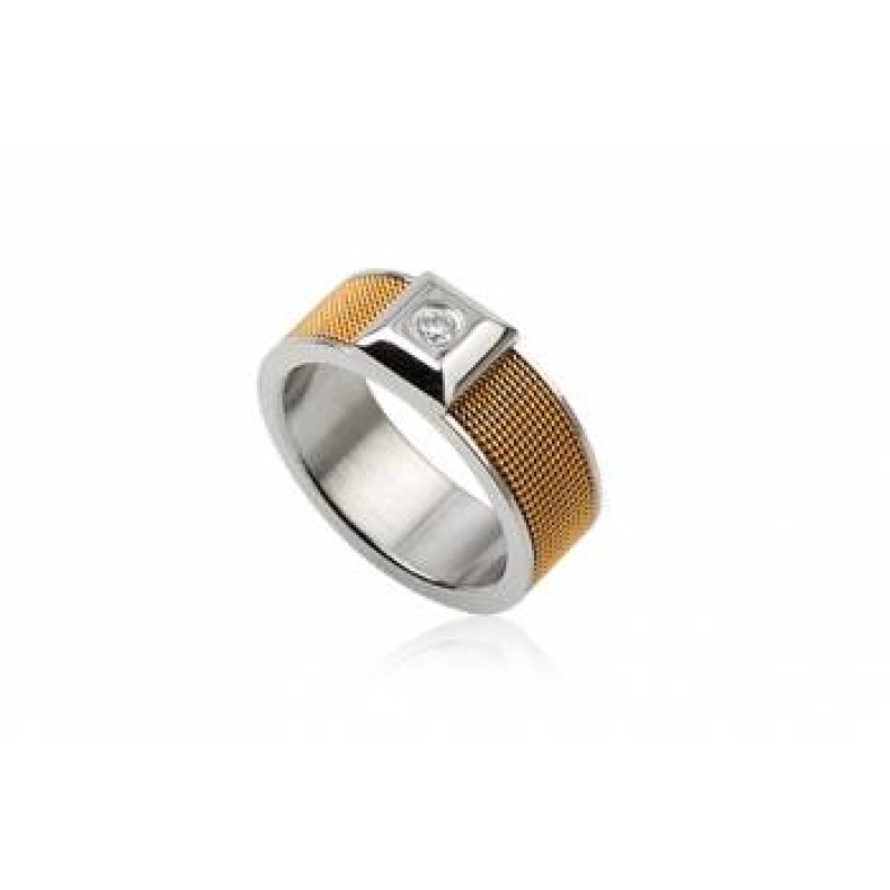 Terasest sõrmus - kullatud punutud muster, kesksel kohal kõrgem 3mm valge tsirkoon. Sõrmuse laius 8mm, suurused 20 ja 20,5