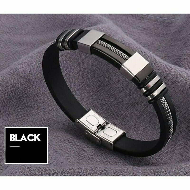 Kummise paelaga käekett meestele - kesksel kohal musta terasega plaat, keskelt jookseb terasest pael. Käeketi laius laius 10mm. Käeketi pikkus 22cm