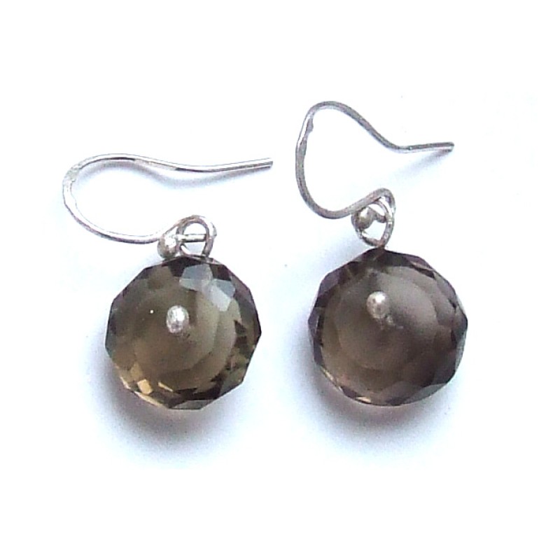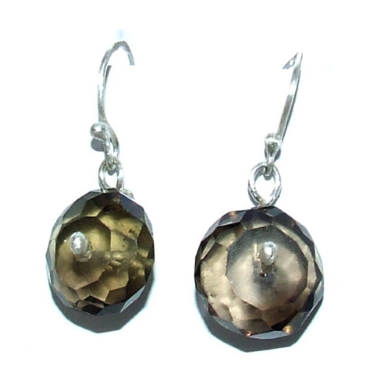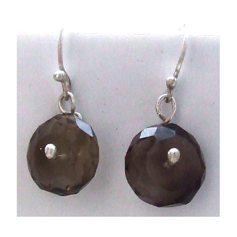 Hõbekõrvarõngad 925 märgistusega. Naturaalne tahuline suitsukvarts läbimõõduga 1,3cm. Kõrvarõngaste pikkus 3cm.
