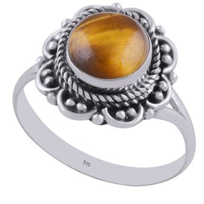 Materjal 925 hõbe, naturaalne tiigrisilm 8mm. Sõrmuse suurus 17,3, kaal 3,5g. India käsitöö