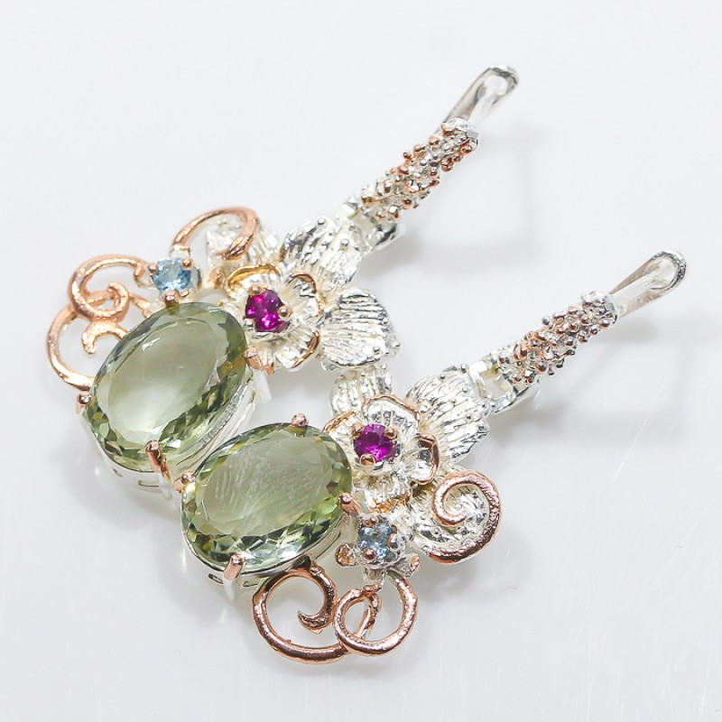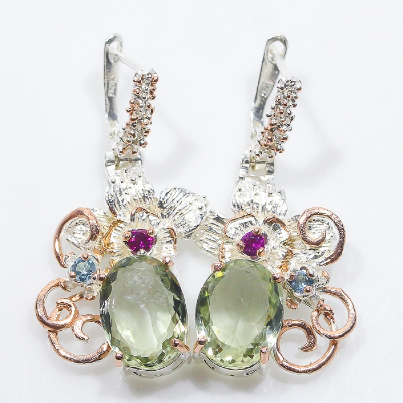 925 hõbedast eksklusiivsed kõrvarõngad rohelise ametüstiga. Lisaks väike topaas ja rodoliit . Kõrvaõrngaste kaal 14,72g, pikkus 4,5cm.