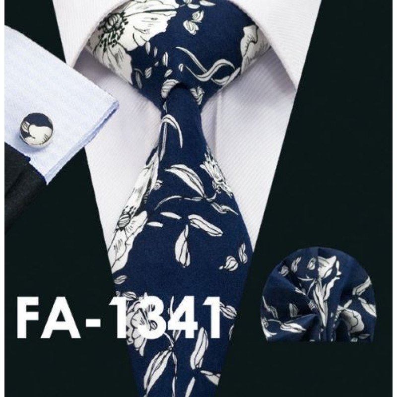Tumesinisel taustal suuremad valged lilled, sitsisem materjal, laius 8cm. Komplektis on lisaks taskurätt ja mansetinööbid.