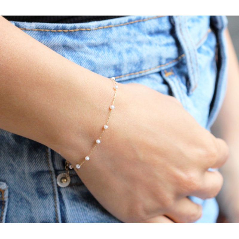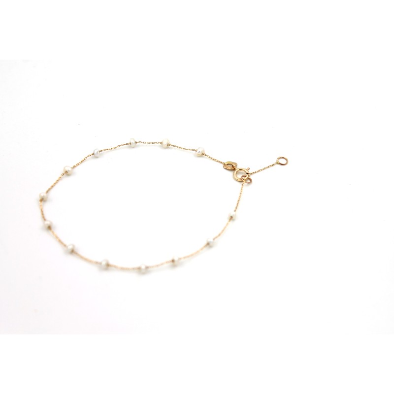 585 prooviga kollane kuld, pikkus 19cm, saab kinnitada ka 17cm pealt. Mageveepärlid 2,5mm läbimõõduga. Kaal 0,60g.