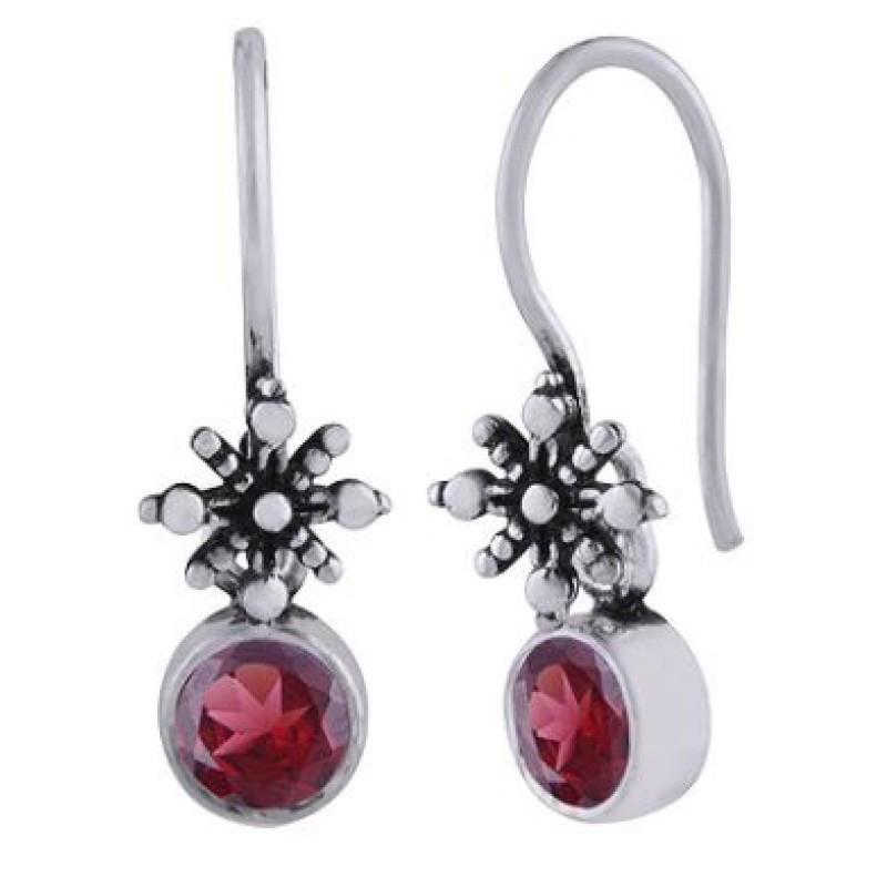 Hõbekõrvarõngad 925 prooviga, India käsitöö. Naturaalne tumepunane granaat 6mm, üleval lille motiiv. Kõrvarõngaste pikkus 2,5cm. Kaal 2,0g