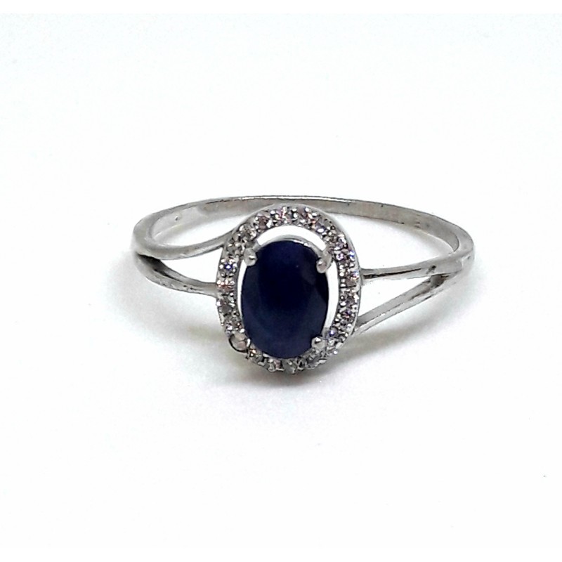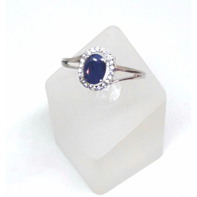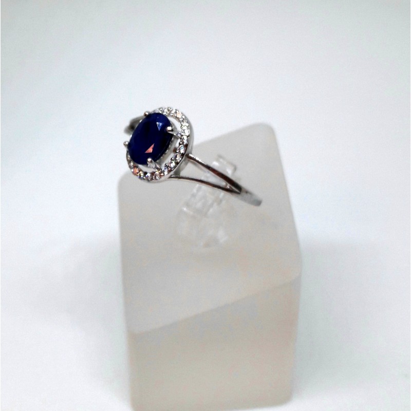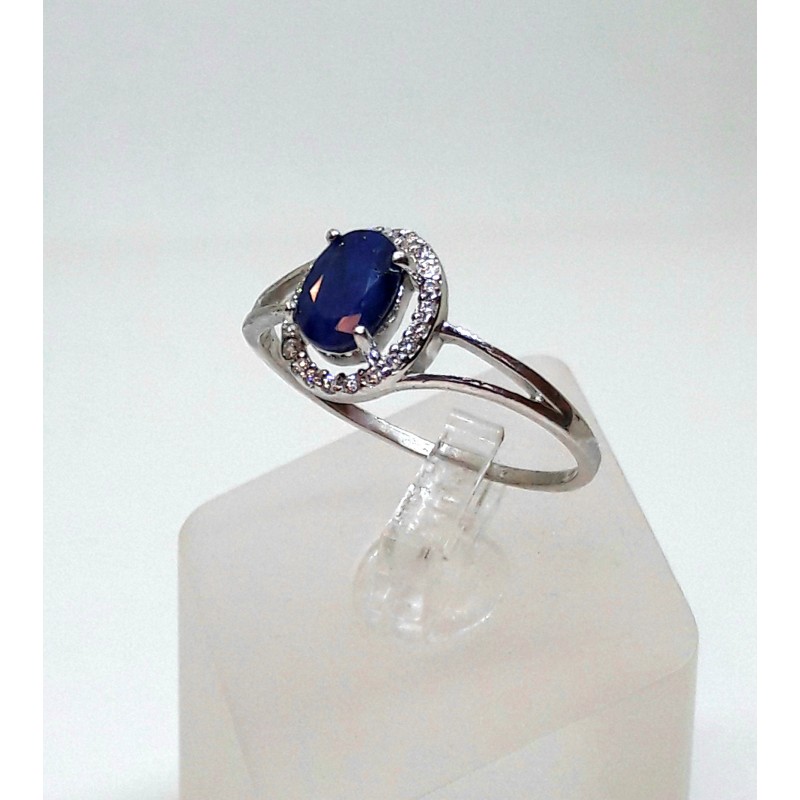 925 prooviga hõbesõrmus, naturaalse safiiriga 7x5mm, ümber safiiri väikesed valged tsirkoonid. Sõrmuse suurus 19. Sõrmuse kaal 1,5g