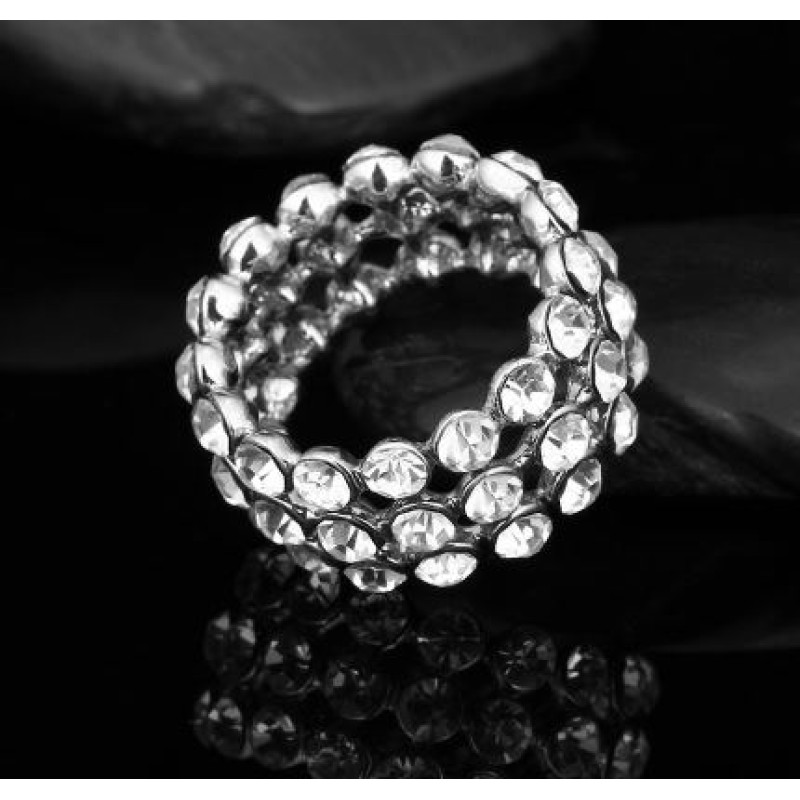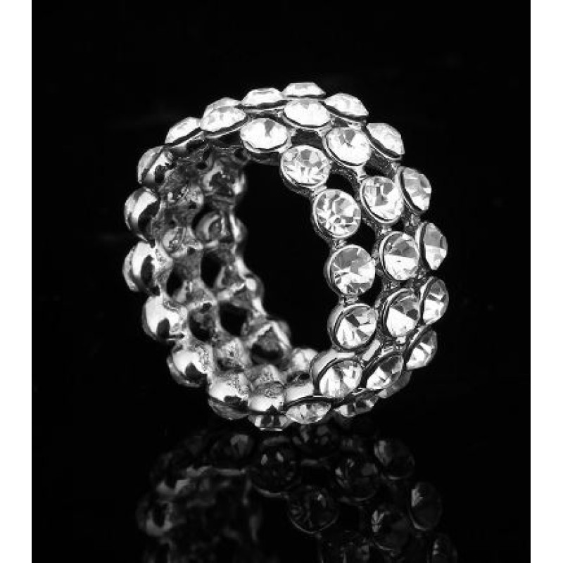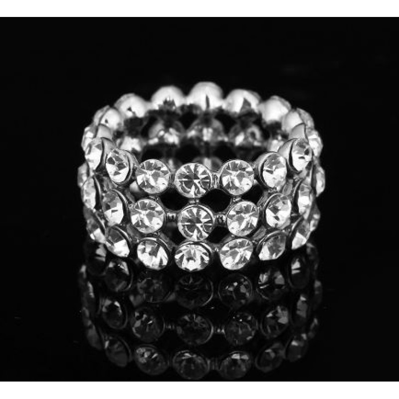 Baasmetall ülehõbetatud, 3 rida valgeid Austria kristalle. Sõrmuse laius 1,2cm. Saadaval suurus 18.