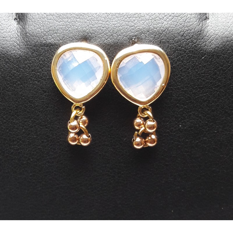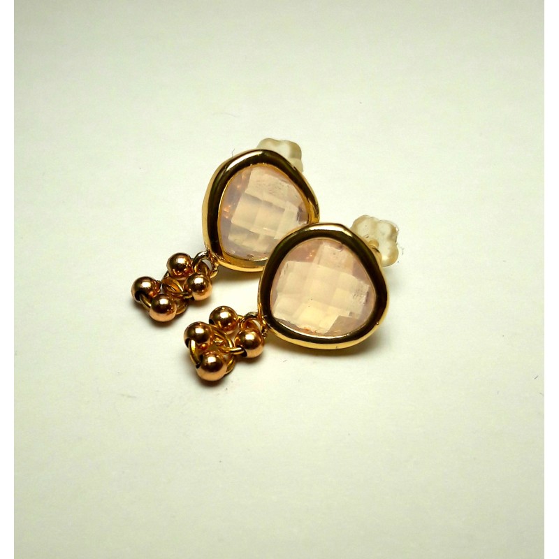 Pilku püüdvad kullatud kõrvarõngad tahulise roosa tsirkooniga, otsas ripuvad kullapressiga (gold filled) 4 mummu. Kõrvarõngaste pikkus 1,8cm, paari kogukaal 2g. Kõrvarõngaste osa on allergiavabast plii ja nikli vabast baasmetallist, ülekullatud kollase kullaga. Kõrvarõngastel on plastist tagused.